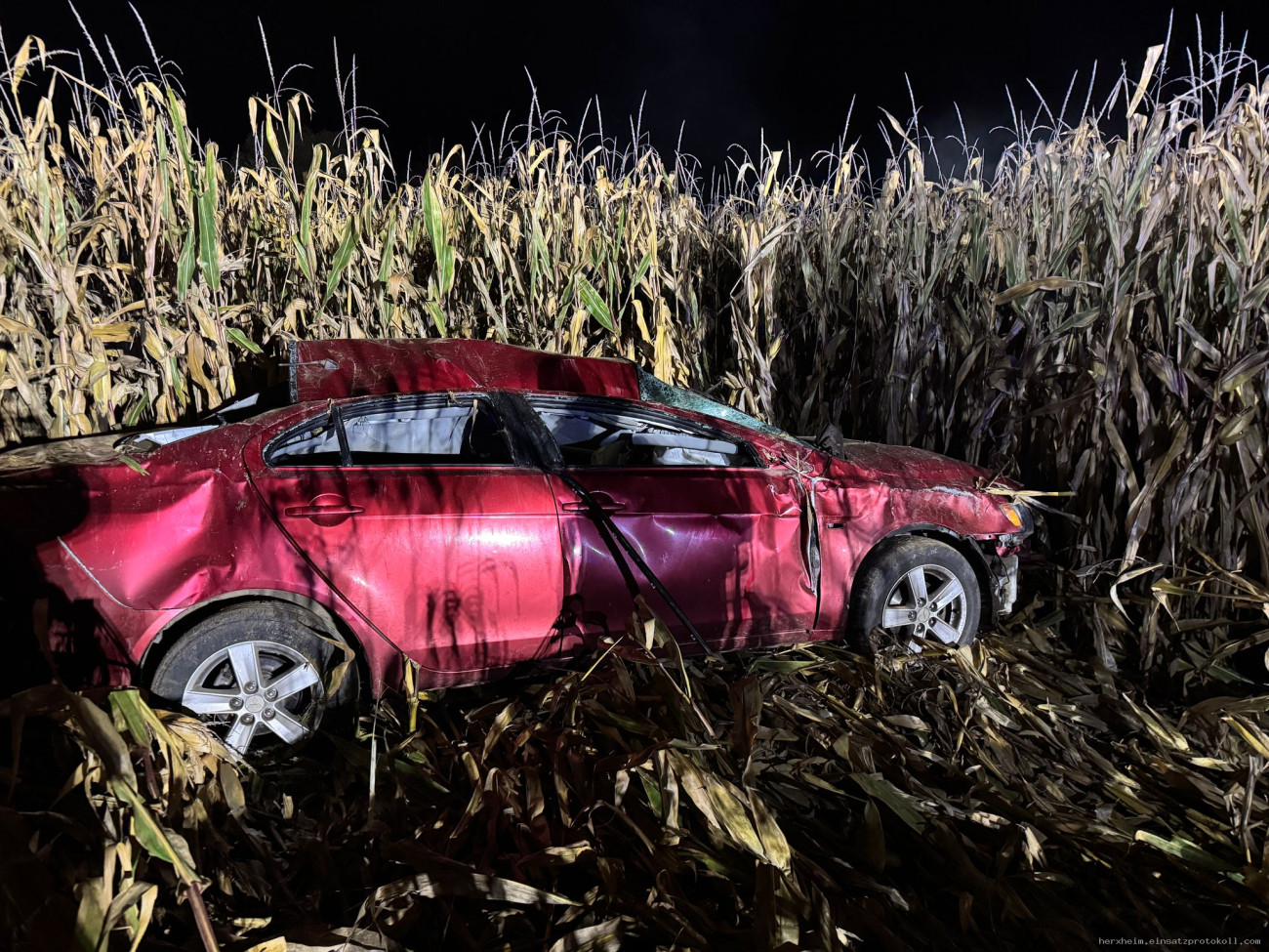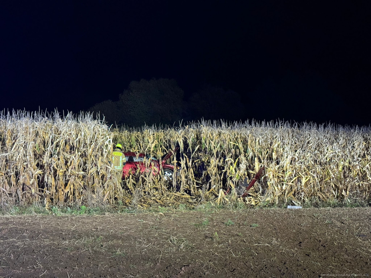 Vor Ort hatte sich ein PKW mehrfach überschlagen und lag im benachbarten Maisfeld. Bei der Ankunft der Feuerwehr war keine Person im Fahrzeug eingeklemmt oder eingeschlossen.